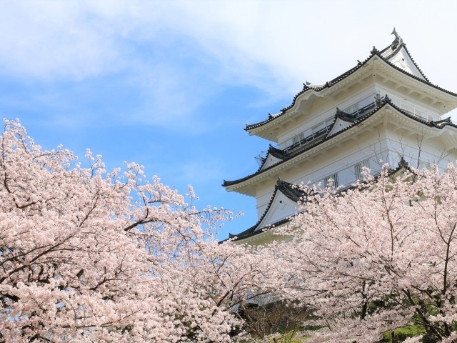 1960(昭和35)年に復興された天守閣がそびえる公園。天守閣やお堀を取り囲むように約300本の桜が彩りを添える。「さくら名所100選」にも選定された桜風景を見に多くの人が訪れる。また、公園内には子どもも楽しめるNINJA館や、甲冑などの着付け体験ができる施設がある。