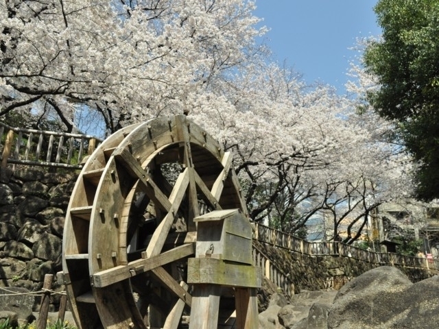 「かながわの花の名所100選」に選ばれた古くからの桜の名所。元住吉駅の近く、渋川に沿ってソメイヨシノが約2kmにわたって華やかに咲き誇る。桜並木の散策とともに、すぐ近くにある「中原平和公園」でもお花見を満喫できる。