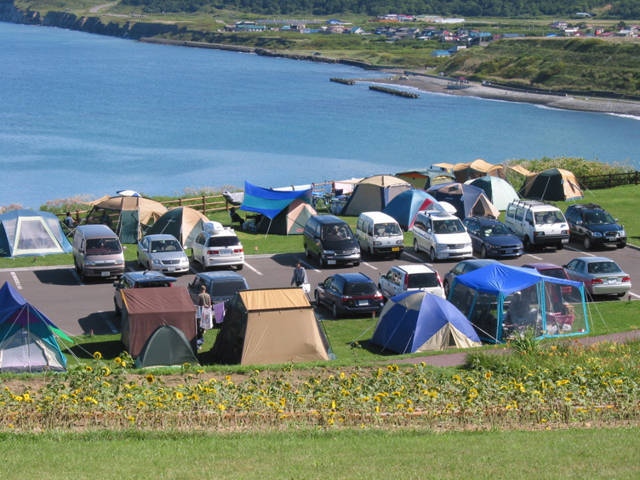 海を見下ろすロケーション。園内にはパークゴルフ場や天文台があり、海を望む露天風呂があるしょさんべつ温泉「ホテル岬の湯」で日帰り入浴もできる。バンガロー利用は「ホテル岬の湯」で受付。
