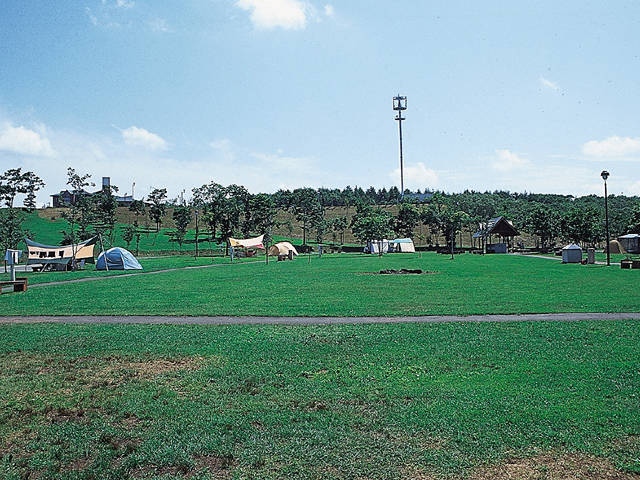 円形の園内通路の内側にきれいな芝生のテントサイトと駐車スペースが整備されたキャンプ場。市街地や温泉も近く、不便なく快適に過ごせる。