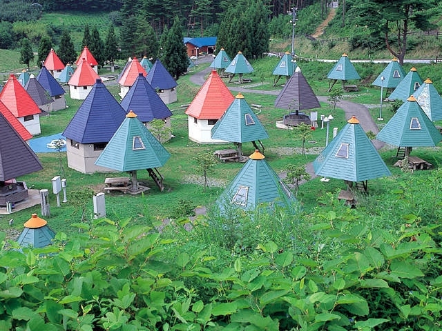 名久井岳の山麓にカラフルな屋根が印象的なツリーハウスが30棟建ち並ぶ。隣接のオートキャンプ場にはテントサイトが20区画あるほか、冷暖房などを備えた快適なケビンハウスもある。