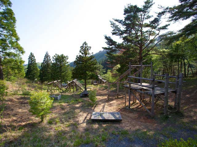 スノコが置かれたオートサイトやテント専用のフリーサイト、コテージもあり、料金はリーズナブル。公園内には森林セラピーロードがありトレッキングが楽しめるほか、子どもが遊べる木製遊具もたくさんある。