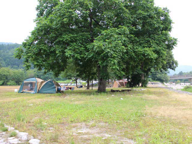 伝説の巨大魚タキタロウにちなんだキャンプ場は渓流沿いの広場。車の乗り入れが可能で、登山や釣りのベースに最適である。