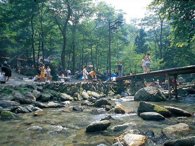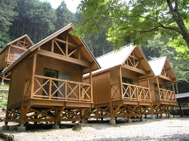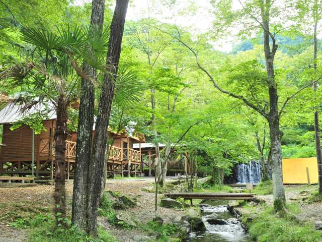 サイトはやや狭さを感じるものの、AC電源や流し台が設置されていて使い勝手は良い。場内に流れる都幾川では魚とりや水遊びを楽しむ子ども達で賑わう。ログハウス風のバンガローも人気だ。