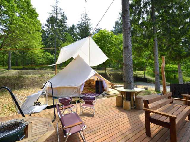 霊仙寺湖の湖畔にあるカラマツ林に囲まれた静かなキャンプ場。オートサイトのほかに充実施設のログハウス風ケビンや、大型ラグジュアリーテントを使ったグランピングサイトなどもある。温泉施設隣接で好立地。