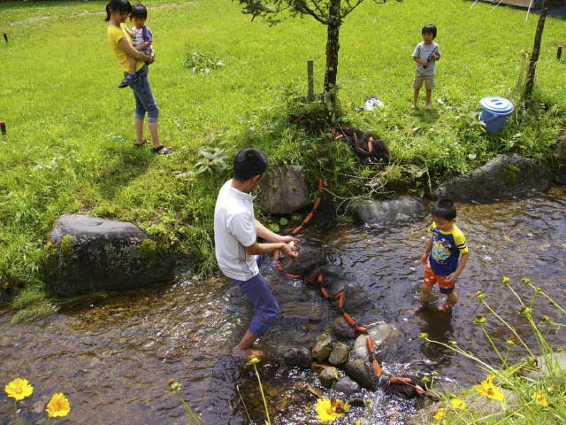 - 炊事棟、水洗トイレ、温水シャワー、風呂(温泉)、ランドリー、自販機、釣り堀、岩魚掴み取り、休憩室