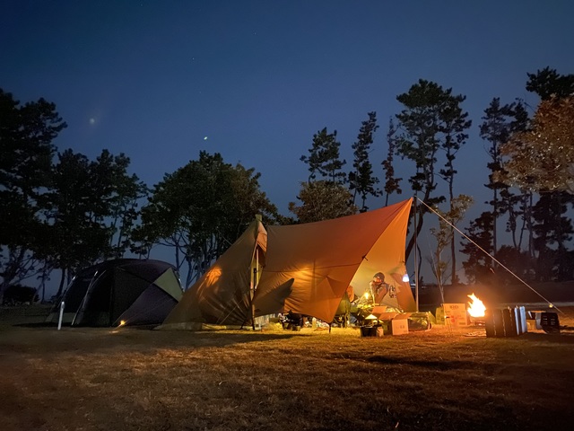 - 自転車、イス、テーブル、タープ、BBQコンロセット、焚火台ほか
