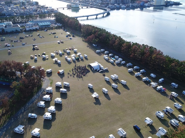 渚園は浜名湖に面し、テニスコートや多目的運動場などがある複合施設。キャンプ場は広々とした芝生広場がフリーのテント専用サイト、奥側がオート区画サイトになっている。