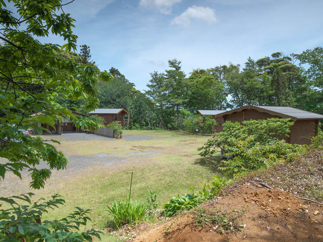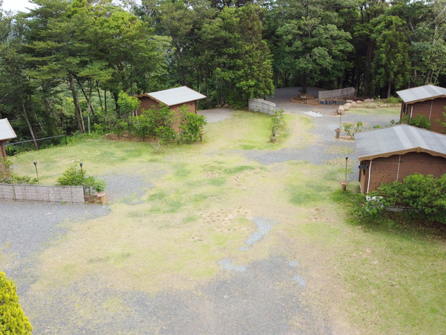 木々の間から海も望めるロケーション。収容人数が30人程度のためのんびりと過ごせるキャンプ場。テントサイトは広めで、ログハウスには専用の庭付き。