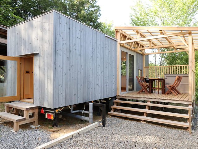 サイトはゆったりサイズのオート区画サイト、芝生の区画テントサイト、ウッドデッキのテントサイトの3タイプ。宿泊施設は古民家風バンガローや山小屋風キャビン、トレーラーハウスがあり、好みのスタイルで楽しめる。