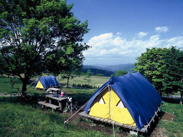 大洞山山麓の標高700mの高原に広がるキャンプ場。サイトは車の乗り入れができる開放感抜群の草地のフリーサイトと林間のデッキサイトがある。展望がよく夜は満天の星が圧巻だ。