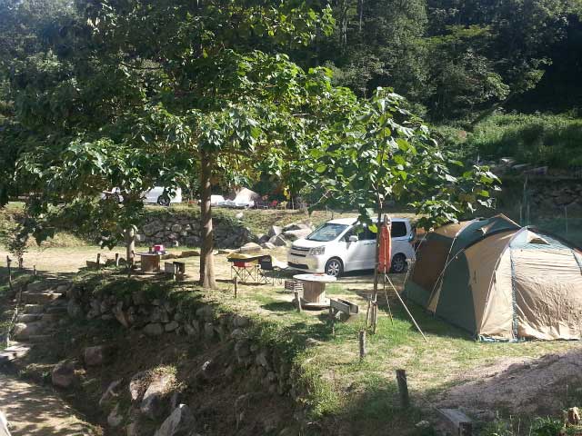 標高500mの高原にあるキャンプ場。全9区画のサイトは昔の棚田を利用して作られ、場内は山里のアットホームな雰囲気にあふれていて、陶芸体験(有料)もできる。アクセス道路が一部狭いので要注意。