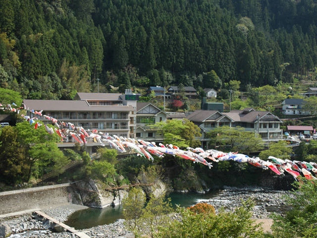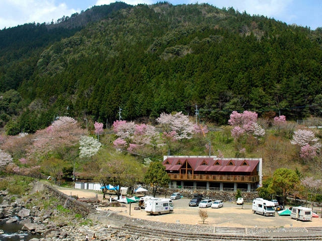 5月には川の両岸に渡したワイヤーに架けられて、川の上を泳ぐ色とりどりのこいのぼりが圧巻。キャンプ場は清流での釣りや川遊びをはじめ、自然の中で遊べる環境が整っている。対岸の温泉施設も便利だ。