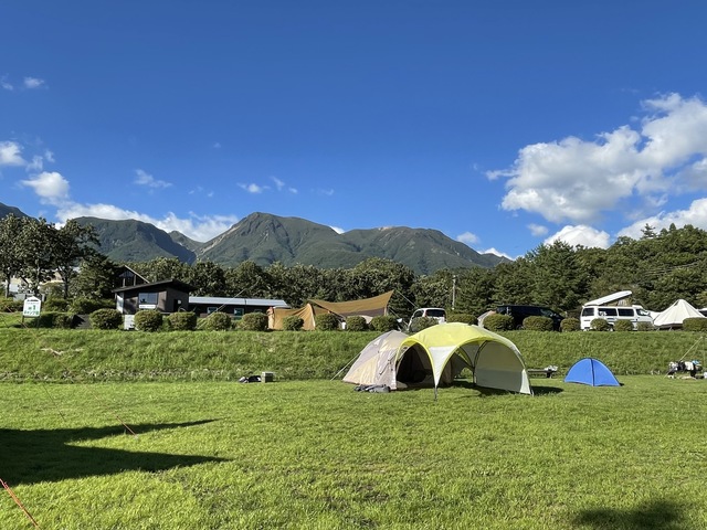 高原の開放的なサイトからは山々の眺望やきれいな星空が見られる。広大なホテルの敷地内にあり、温泉に入れるのもうれしい。くじゅうマルシェでは地元食材を販売しておりキャンプでの買い物に便利。