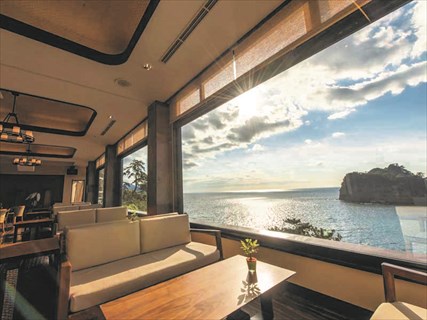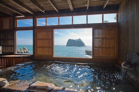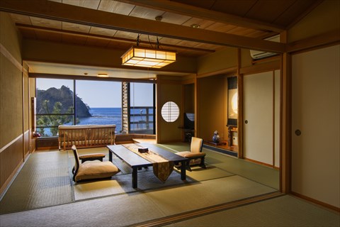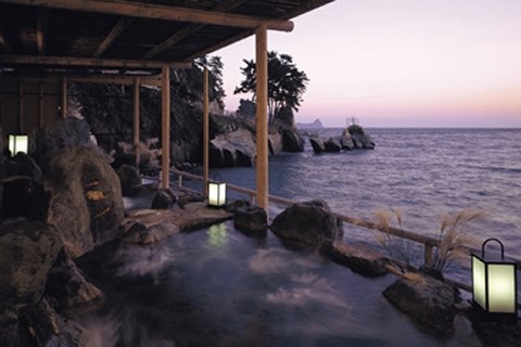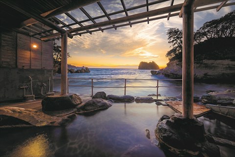 雄大な自然美を誇る西伊豆の海辺に面し、随所から望める大海原の景観に非日常を味わえると評判の宿だ。もっとも海の間際に位置する「海辺の露天風呂」は開放感抜群で最高のロケーション。野趣あふれる雰囲気の中で波音と潮風に身を委ね、天然温泉を享受できる。ほか、2つの貸切風呂やサウナ付きの展望大浴場からも、大パノラマを眺めながらの湯浴みが楽しめる。客室は、露天風呂付きや二間続きのジュニアスイート和室、ゆとりのあるデラックス和室などを用意。リーズナブルに泊まれるエコノミー客室からの眺めも抜群で、どの部屋も素晴らしいオーシャンビューが癒しの空間を演出する。伊豆の海で育まれた旬の魚介中心の夕食は、厳選された素材や郷土の名産など、目でも舌でも楽しめ創作和会席。朝食でいただく郷土料理「まご茶漬け」はここならではの味わい。