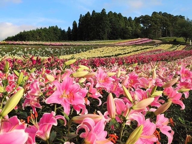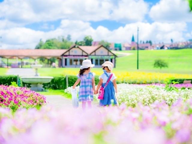 広大な芝生広場を中心に関東最大級のパターゴルフコースをはじめ、芝そりゲレンデ、身長90cm以上から乗れる「ブタ天キッズコースター」、観覧車などアトラクションが充実。レストランではバーベキューやドイツ料理、軽食が楽しめる。四季折々の花々が咲き誇る、千葉を代表する花名所のひとつでもあり、春のネモフィラや芝桜、夏のひまわり、秋のマリーゴールドなどの風景は圧巻。また、冬はイルミネーションも楽しめる。
