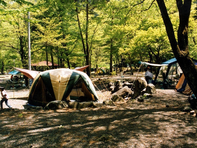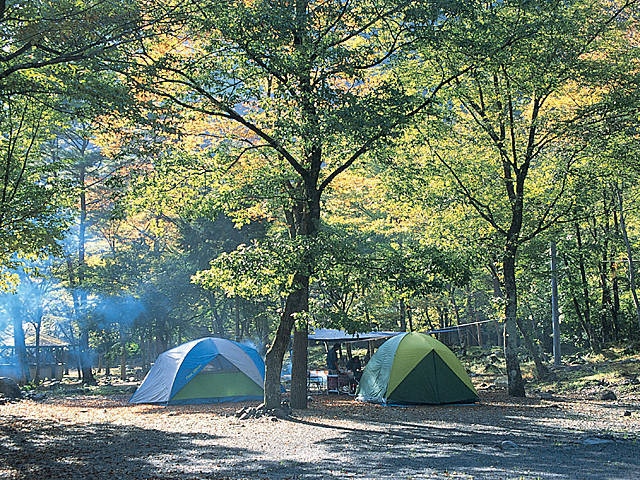 安倍川上流の山間にあるキャンプ場。サイトはきれいに整地され、適度に木立があるので夏でも過ごしやすい。クルマの乗り入れは不可だが、荷物搬入用のリヤカーも用意されている。黄金の湯に近いのも魅力だ。場内の水は飲用不可なので、飲料水の準備が必要。