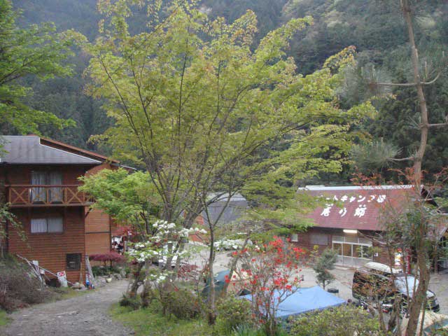 山間にある素朴な雰囲気のキャンプ場。風呂や炊事場など場内施設のほとんどは、中央棟と呼ばれる建物内にまとめられ使い勝手もよい。山深い場所にあり、緑の中でのんびり過ごすには抜群のロケーションだ。