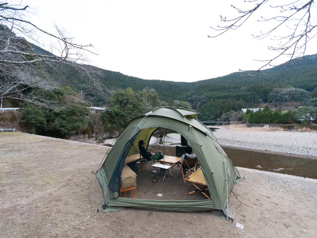 河原のサイトでのんびり過ごせるオートキャンプ場。場内施設は必要最小限で規模は大きくないが、充実した設備のコテージがあり、手軽にキャンプを楽しめる。温泉施設がそばにあるのもうれしい。