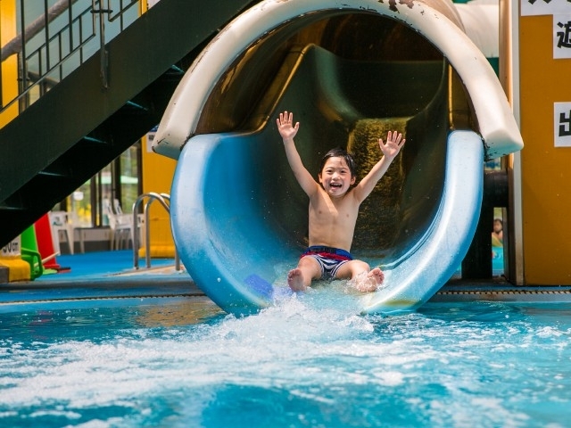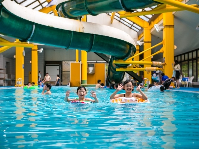 白樺リゾート池の平ホテル内アミューズメント館にある室内温水プールは、天候を気にせずにオールシーズン利用可能。高さ4.2m、全長40mのコースを時速14kmで一気に滑り降りるウォータースライダーは、大人も子どもも大興奮!水深50cmの子ども用コーナーもあり、家族での利用も安心。水着やタオルのレンタルもある。毎週土曜、長期休暇シーズンには1日1組限定で貸切プールもあり(要問合せ)。