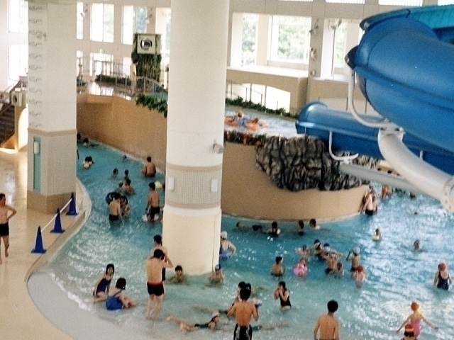 1年間を通して利用可能な室内温泉プール。本格的な50mプールをはじめ、水の流れとさざ波ほどの波に乗って遊べる流波プール、2種類のスライダーなど様々な設備が充実。さらにジャグジーやミストサウナなどのリラクゼーション施設もそろっており、子どもからお年寄りまで家族で楽しめる。(ミストサウナ・採暖室は利用人数を制限して利用可)