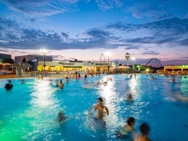 ゴムボートで滑り降りる「ジャイアントスカイリバー」などのスライダーや、流れるプールなど5つのプールで大人から子どもまで1日中楽しめる。2023年には新エリア「わいわいジャングル」がオープンした。(最新情報は公式ホームページを参照)
