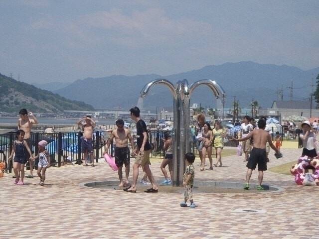 広島市内から一番近い海水浴場。長さ約1200mの美しい人工砂浜と歩道が続き、瀬戸内海に沈む夕日を海岸から眺めることができる。駐車場や屋内・屋外シャワー、更衣室など施設も充実している、快適なシーサイドリゾート。