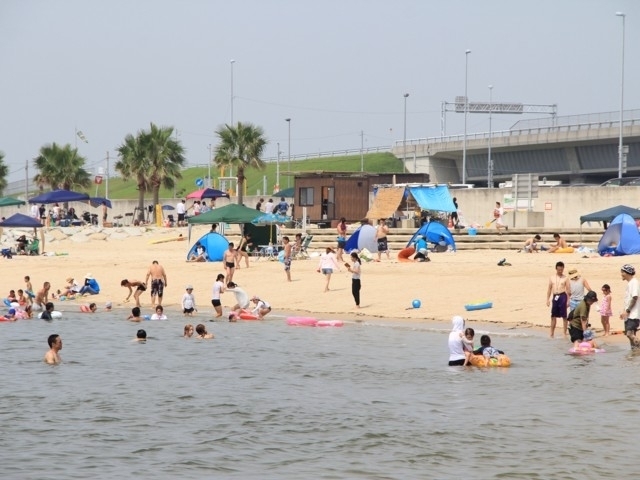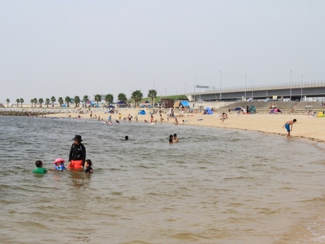 中部国際空港(セントレア)の対岸にあるビーチ。防波堤に囲まれた内湾にあり、非常に穏やかな波と白い砂浜が広がる。グランピングスタイルのバーベキュー施設があり、空港を離発着する飛行機や、夕焼けの景色を眺めながら食事を楽しむこともできる。