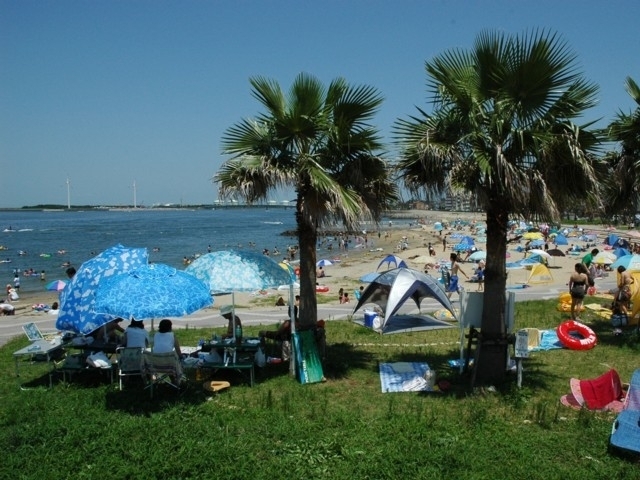鎌倉時代の潮湯治に始まり、世界最古といわれている砂浜のきれいな海水浴場。こぢんまりとした浜辺からは鈴鹿山脈に沈む夕陽を望むことができ、地元住民や子ども連れの観光客に親しまれている。