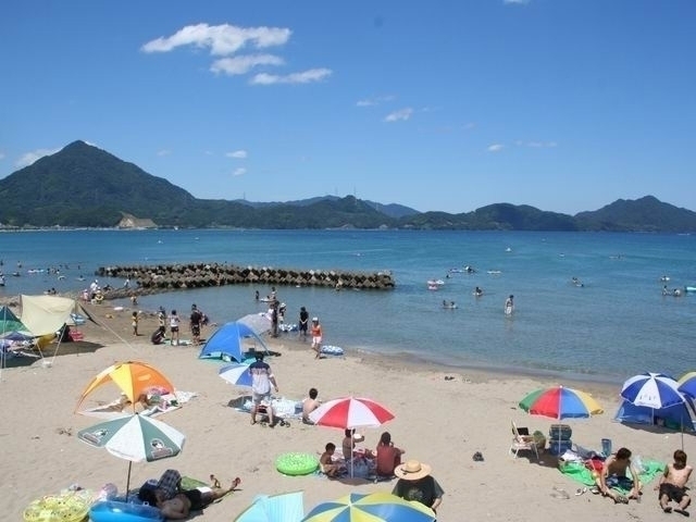 幅20mの浜がおよそ2kmにわたって続く。水の透明度も高く、波は穏やか。町内の海水浴場の中でも比較的混雑が少なく、のんびりと過ごすのに最適だ。右手には、海釣り公園があり、近くの鷹島・稲島まで橋づたいに歩いて散策することもできる。