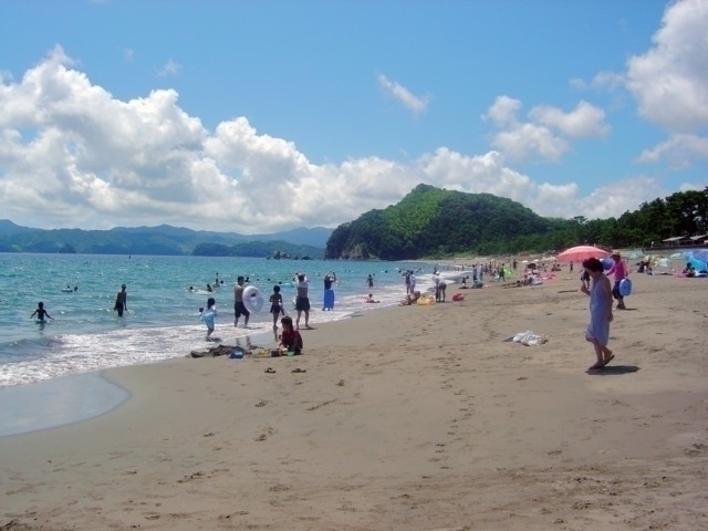 広大な松原に囲まれた約2kmにもおよぶ浜は、遠浅で波も静か。水質も抜群で、「日本の渚百選」のひとつでもある。臨海道路や駐車場、シャワーなども整備され、家族連れや、若者達でにぎわう。