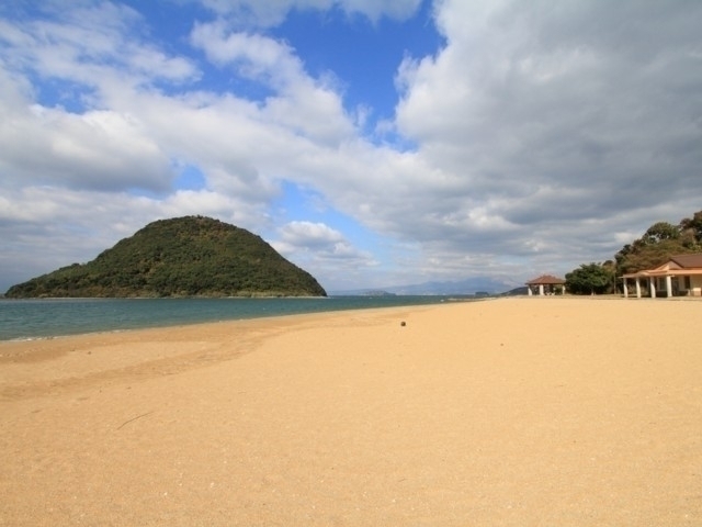 青い海がきらめく樋合島のビーチ。天候に恵まれれば、遠く雲仙普賢岳が望める。海の家やシャワーなどの施設が充実し、ファミリーにも人気が高い。潮が引くと、向かい側に浮かぶ高杢島(たかもくじま)まで歩いて渡ることができる。