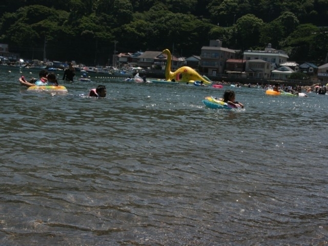 戸田港に突き出た岬の内海にある、林に囲まれたビーチ。波穏やかな海のバックには松林が広がり、夏の暑さをしのぐのに最適。海上には遊具も設置され、子どもたちにも人気がある。