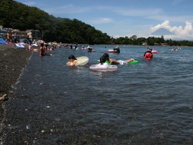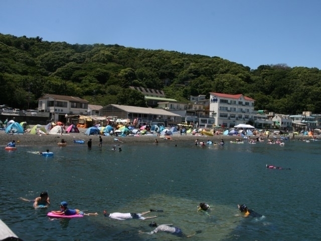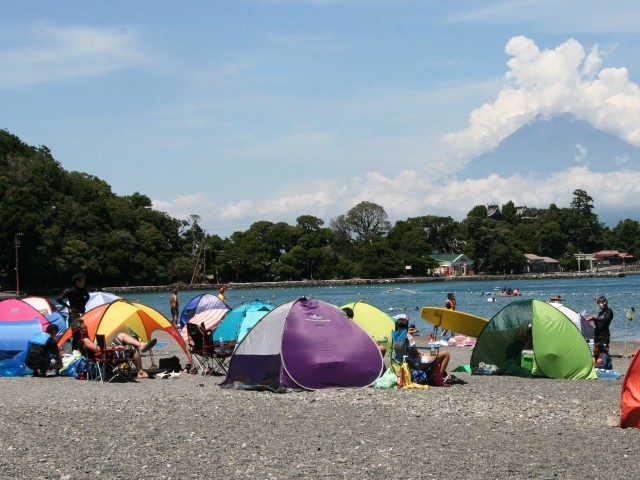 遠浅、水質良好、穏やかな波の海水浴場で家族連れにも大人気。「快水浴場百選」にも選ばれた美しい海岸から、国の天然記念物のビャクシン樹林に覆われた大瀬崎と富士山の姿を望むことができる。自然豊かな海岸は、ダイビングスポットとしても有名で、1年中ダイバーたちでにぎわう。