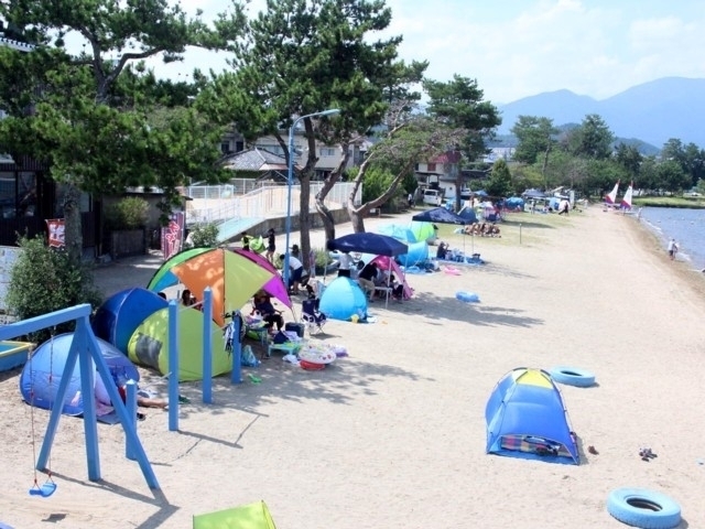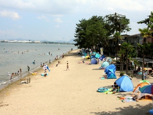 琵琶湖大橋に近く、京阪神からもアクセスしやすい湖水浴場。約500mの浜辺は遠浅で子連れにも安心。水際での砂遊びも人気だ。ペット遊泳エリアでは、ペットと一緒に泳ぐこともできる。