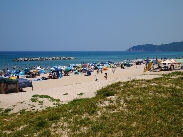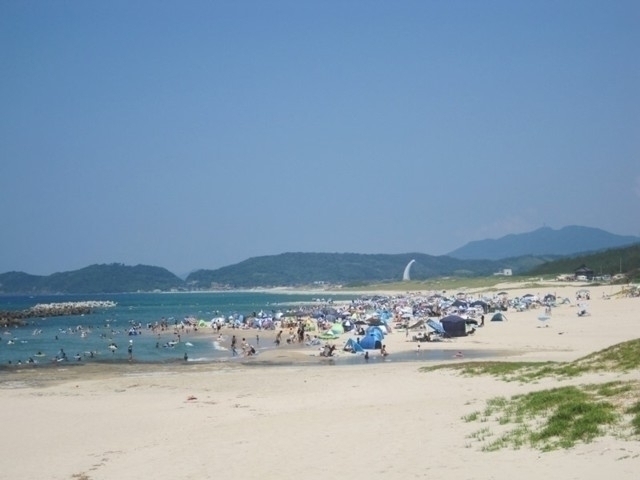 「快水浴場百選」に選定されている、県立石見海浜公園にある海水浴場。約3.5kmにもおよぶ白砂の海岸線沿いにある2つの海水浴場のうちのひとつ。海水浴場の近くには無料キャンプ場やケビン村、テニスコートもあり、家族連れなどでにぎわう。7月中旬頃からはライフセーバーが行うマリンスポーツ体験も予定されている(詳細は公式ホームページを参照)。
