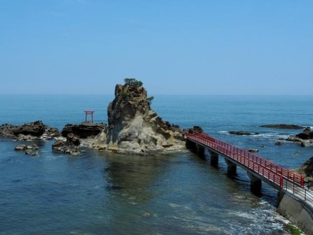 目の前に弁天島と鳥居がある、砂利が特徴的な美しい海岸