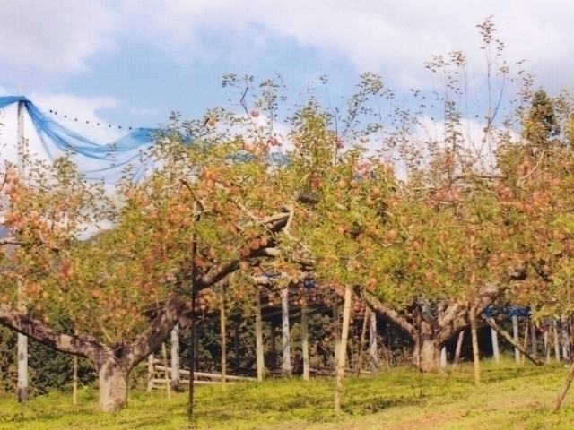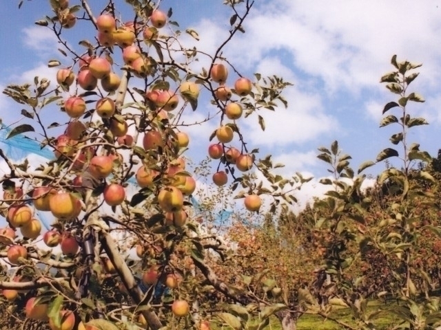 久万高原町にある広さ1万平方メートルを誇り、つがる、千秋、陽光など12品種約300本のリンゴを栽培するリンゴ園。リンゴ狩りのほかに、9月上旬からはサツマイモ掘りも体験可能だ。