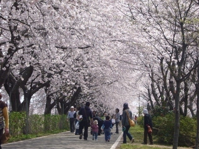 1915(大正4)年に大正天皇即位を記念して桜を植栽し、かつては6000本が連なったことから、「長堤十里世界一」といわれた桜の名所。その後、水害と河川改修でその姿は失われてしまったが、復元が進み、現在では、約2000本の桜を見ることができるようになった。開花時期にあわせて一部夜間のライトアップも行われ、幻想的な夜桜が堪能できる。