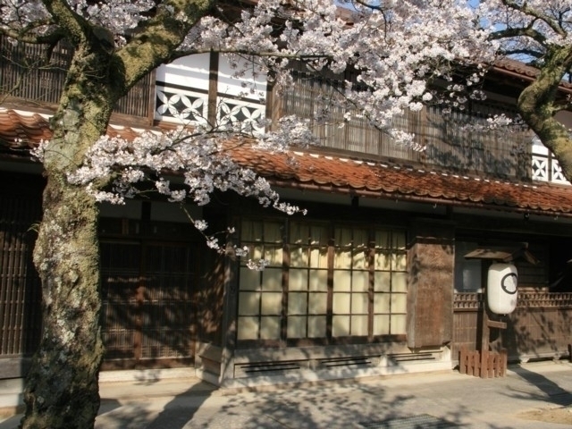 旧出雲街道新庄宿沿いに続く桜並木。日露戦争の戦勝記念に植えられたもので、「がいせん桜」と呼ばれている。本陣跡など風情ある町並みに桜が映えて、見事な景観だ。