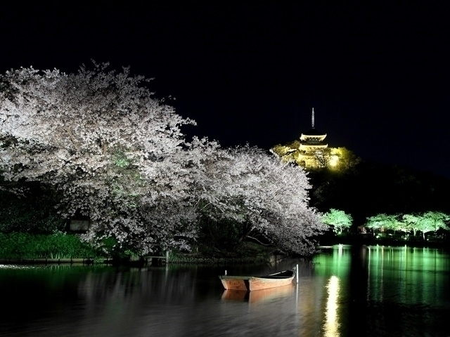 本牧界隈の道路から正門まで続く500mの桜のトンネルが最初の見どころ。園内では夜桜の風情を楽しむ「三溪園 桜めぐり」を開催する。期間中は、京都や鎌倉などから集められた主な古建築物と桜がライトアップされ、昼間とはまた違った幻想的なお花見が楽しめる。園内にある茶店の三溪園茶寮では、細かく刻んだ桜の葉を使ったさくらアイスが好評だ。