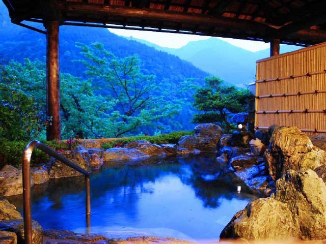 平家の一門の隠れ里として、平家伝説が多く残る秘境、祖谷に建つホテル。ケーブルカーで上がった高台に、天空露天風呂がある。周辺の山々を見渡しながらの入浴は格別の趣がある。