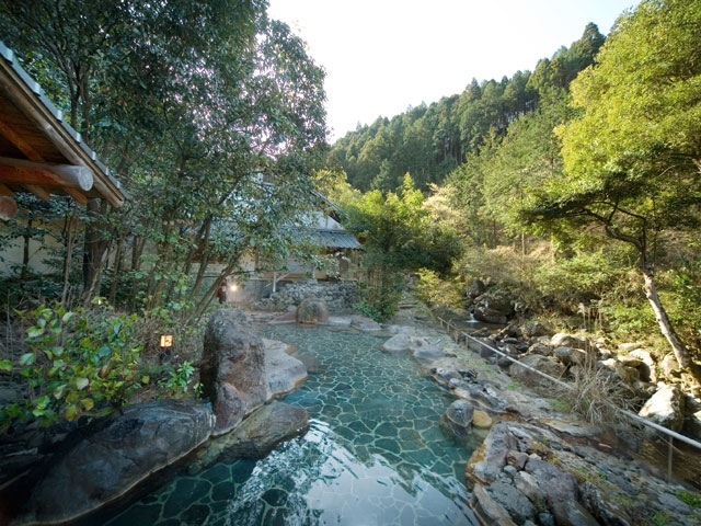 嬉野温泉の湯宿、椎葉山荘に併設の温泉施設。露天風呂は男女とも一度に50人が入れる広々サイズ。椎葉川の渓流が間近に迫る景観は素晴らしい。湯はナトリウム・炭酸水素塩・塩化物泉で、とろりとした肌ざわり。