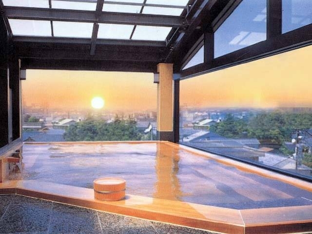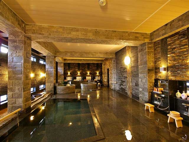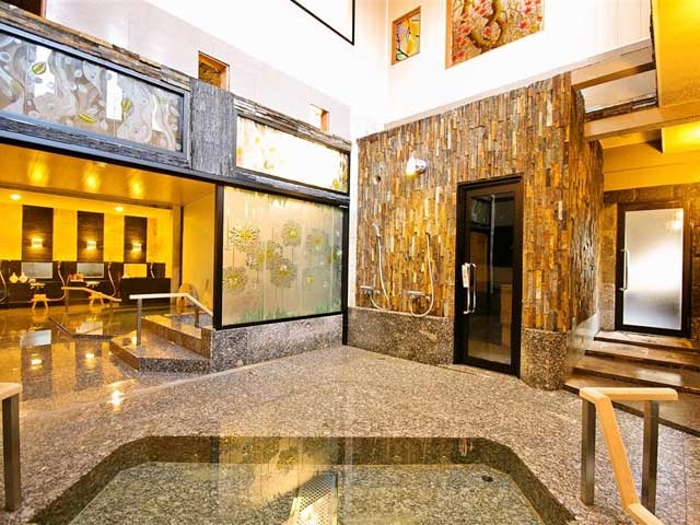 日本の伝統建築を用いた浴場が評判の宿。「平安の湯」、「静の湯」という趣の異なる2つの内風呂を備えた温泉棟「湯元館」をはじめ、庭園大浴場、足湯など、7つの湯が楽しめる「七福湯めぐり」ができる。