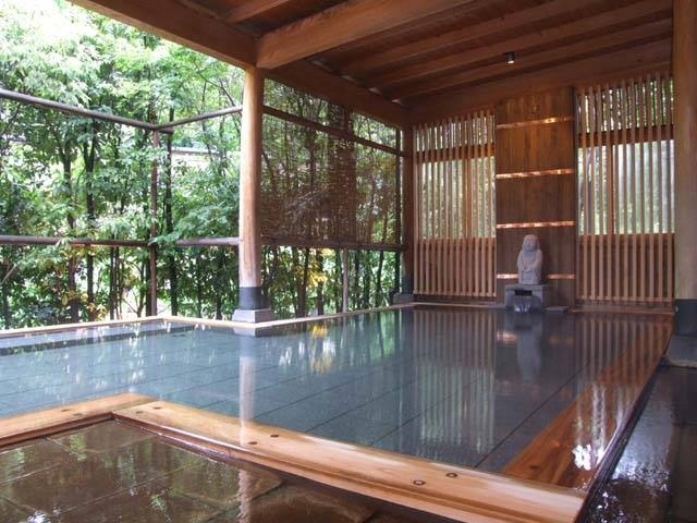 リゾートタイプの宿で、洗練されたモダンなつくり。日帰り入浴利用ができるのは、半露天風呂の「樹彩の湯」と内風呂の「湯滝の湯」。渓流に面した半露天風呂「樹彩の湯」は、川音の響きが楽しめる。
