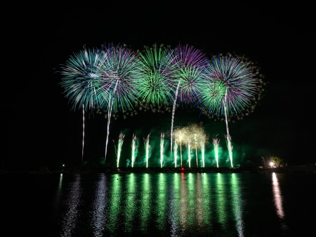 震災で亡くなられた方々への鎮魂と、復興に向けた支援への感謝、来場者の未来への希望を込めて開催。おまつり広場では楽しいパフォーマンスが行われ、軒を連ねる露店も多くの人でにぎわう。そして、夕闇が訪れて花火が上がり始めるとまつりはクライマックスへ。スターマインや10号玉など色とりどりの花火約1万発が夜空に咲き、観客を魅了する。