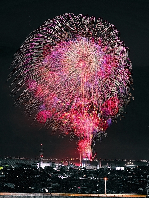 2日間にわたり開催される「木更津港まつり」のフィナーレを飾る花火大会。東京湾を望む木更津港の夜空に、約1万3000発の花火が咲き誇る。中の島大橋周辺から打上げられる花火は、関東最大級の超特大スターマインをはじめ、尺玉の連発など、見どころは盛りだくさん。東京湾アクアラインの海ほたるパーキングエリアから遠くに花火を眺めるのも一興だ。
