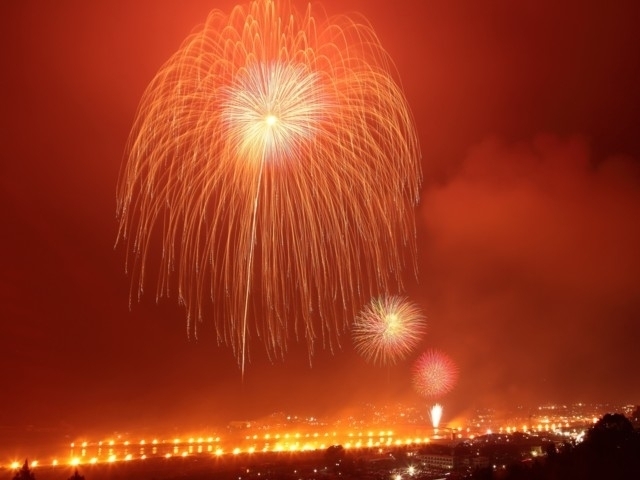 「南部の火祭り」は、山々に囲まれた静かな町、南部町で毎年8月15日に行われる。盆の送り火や川供養、そして稲を害虫から守るための虫送りの意味が込められた郷土行事だ。「投松明(なげたいまつ)」「大松明(おおたいまつ)」「燈籠流し」に続き、富士川の両岸2kmで百八つの円すい形のたき木を燃やす「百八(ひゃくはっ)たい」がはじまると、夜空に花火が打上げられる。いくつもの花火が夜空に勢いよく上がっていき、鮮やかな華を咲かせる。
