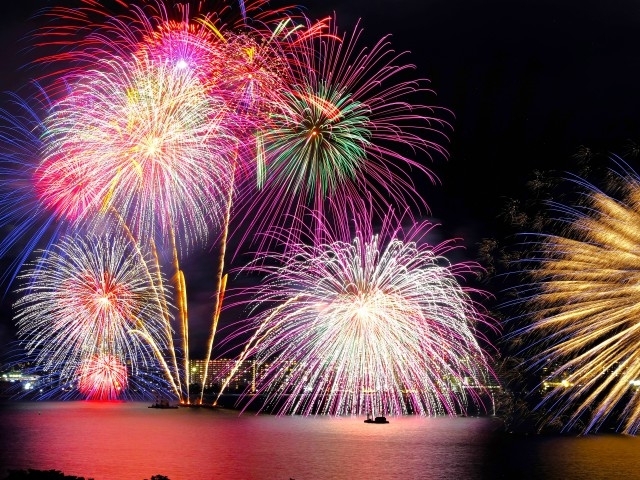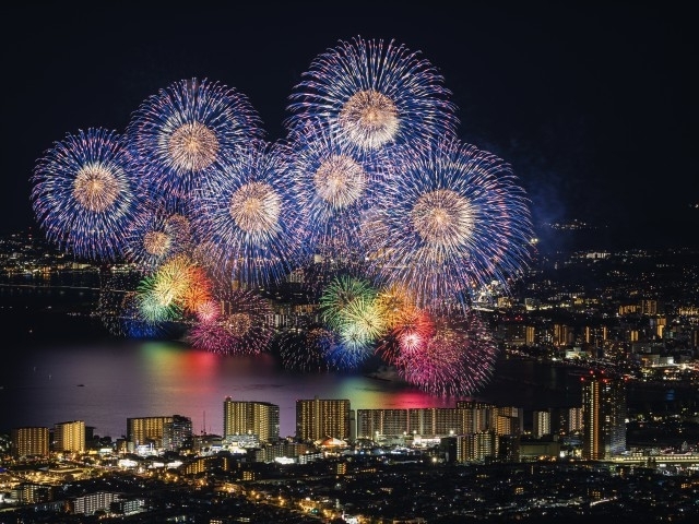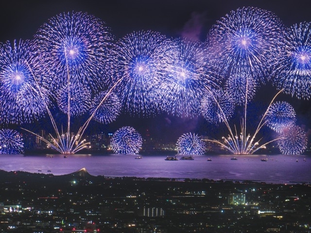 日本最大の湖、琵琶湖を舞台に繰り広げられる大花火大会。今年も約1万発の花火が湖面を色鮮やかに彩る。湖上から次々と打上げられる花火は印象的でロマンチック。そして、さまざまな形の花火が競演する様は、迫力満点だ。湖と夜空を舞台に、華やかで多彩な花火の宴が繰り広げられ、息をつく暇もなく圧倒されてしまう。湖上遊覧と併せて楽しむ人も多く、例年はおよそ30~35万人もの人が集まる。
