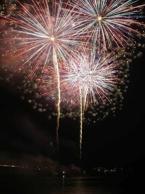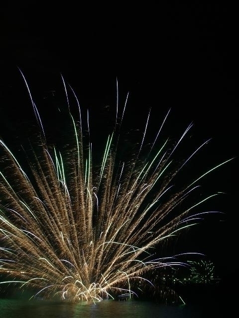 ダム湖に花開く水中スターマインと特大スターマインが美しい